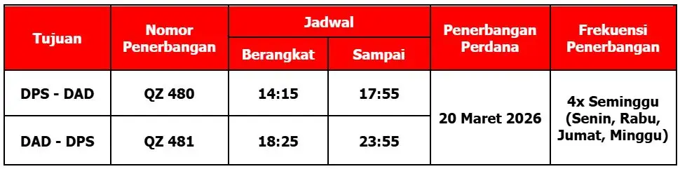 The Bali–Da Nang service will operate under flight number QZ 480. Flights from Bali are scheduled to depart at 14:15 and arrive in Da Nang at 17:55. The return flight from Da Nang will depart at 18:25 and arrive in Bali at 23:55. The inaugural flight is set for March 20, 2026, with services operating four times weekly on Monday, Wednesday, Friday, and Sunday.