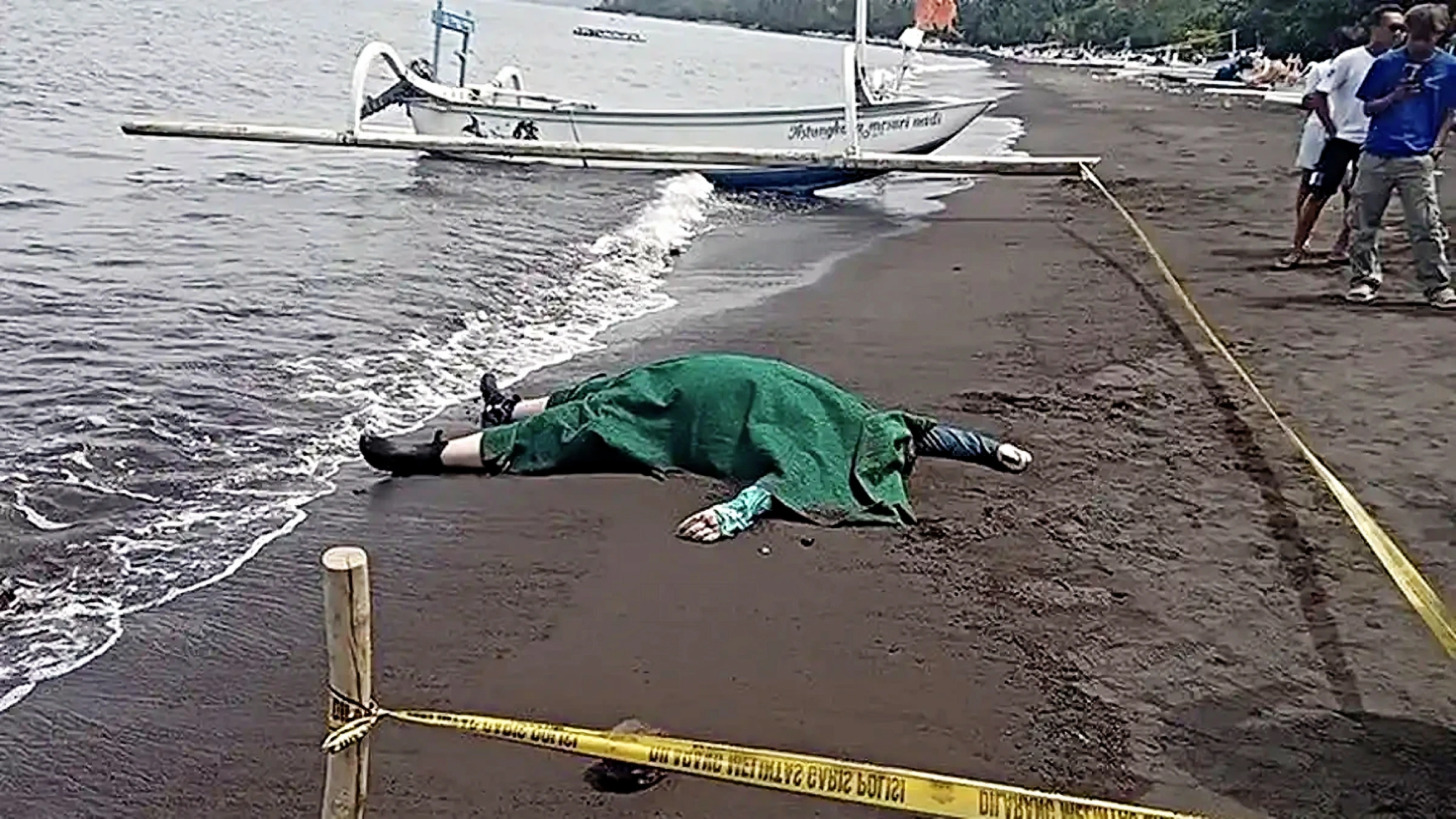 The body of an Australian national is seen on the shoreline at Tulamben Beach, Karangasem, after a fatal diving incident on Tuesday (December 30, 2025).