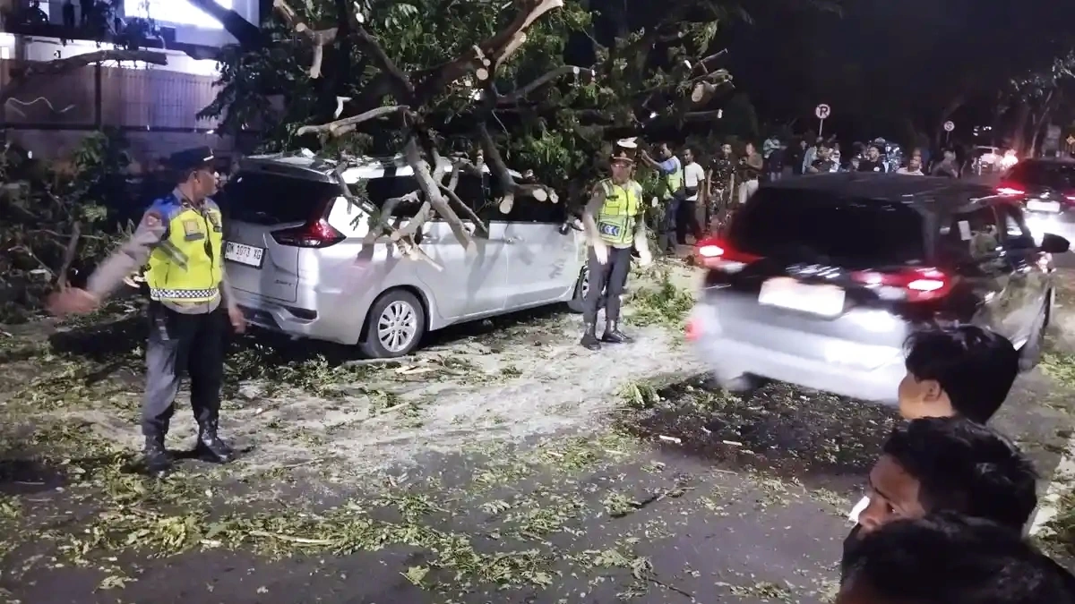 Moments later, the larger tree came down, striking a Mitsubishi Xpander that was unable to avoid impact due to close vehicle spacing. A nearby Toyota Avanza Veloz taxi was also hit by the falling tree.