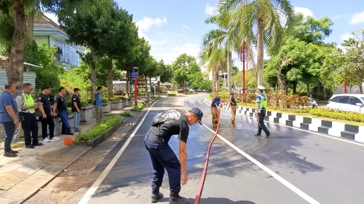 The debris made the road surface slippery, posing safety risks to motorists and pedestrians. To address the immediate impact, one fire truck unit was deployed to wash away soil residue from the roadway. Traffic police from Gianyar Police assisted on site to manage traffic flow during the clean-up operation.