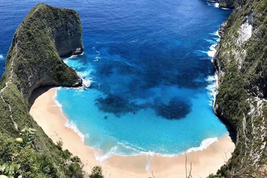 Aerial view of Kelingking Beach, showing its dramatic limestone cliffs and secluded shoreline along the island’s southwestern coast. (Source: trivadvisor.com)