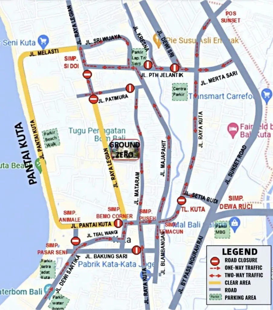 - Patih Jelantik–Legian (Si Doi) Intersection: Traffic toward Ground Zero will be closed and diverted to Jalan Legian Kaja toward Raya Seminyak.