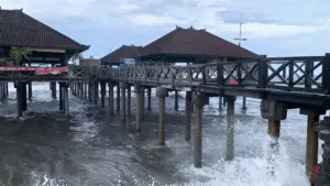 Tourism activities at Old Buleleng Harbor have been temporarily suspended after strong winds and high waves damaged the end section of the pier, raising safety concerns for visitors and local vendors.