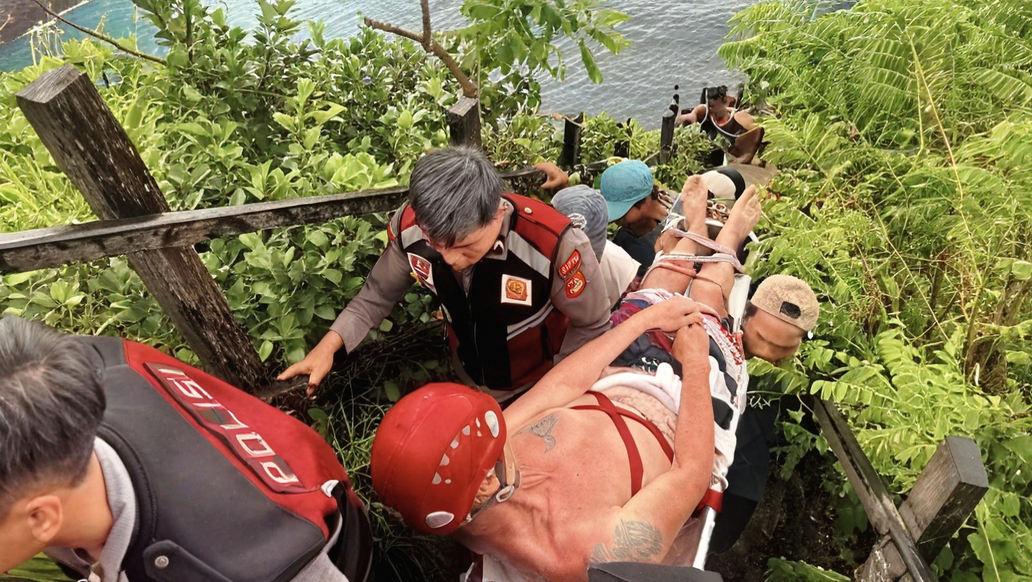 A tourist from the Czech Republic was rescued after being swept by strong waves at Kelingking Beach, Nusa Penida, on Friday (9/1/2026). The victim, identified as Martello Romani (49), survived the incident.