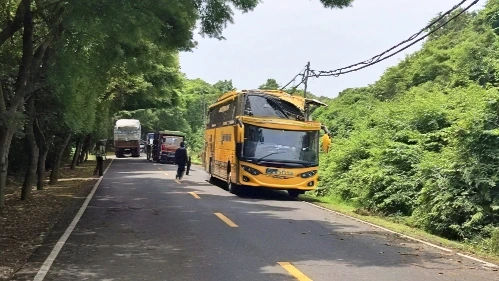 The impact caused significant damage to the vehicle. The front upper section of the bus was severely damaged, while the left-side door and windows were shattered. Despite the extent of the damage, police confirmed that there were no casualties.