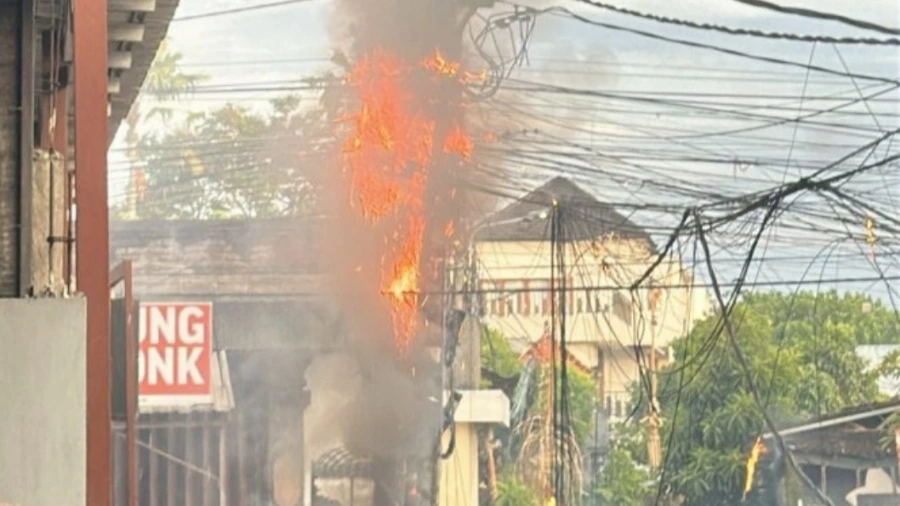Flames engulf provider and PLN cables on Jalan Raya Kerobokan, causing heavy traffic delays before firefighters brought the situation under control.