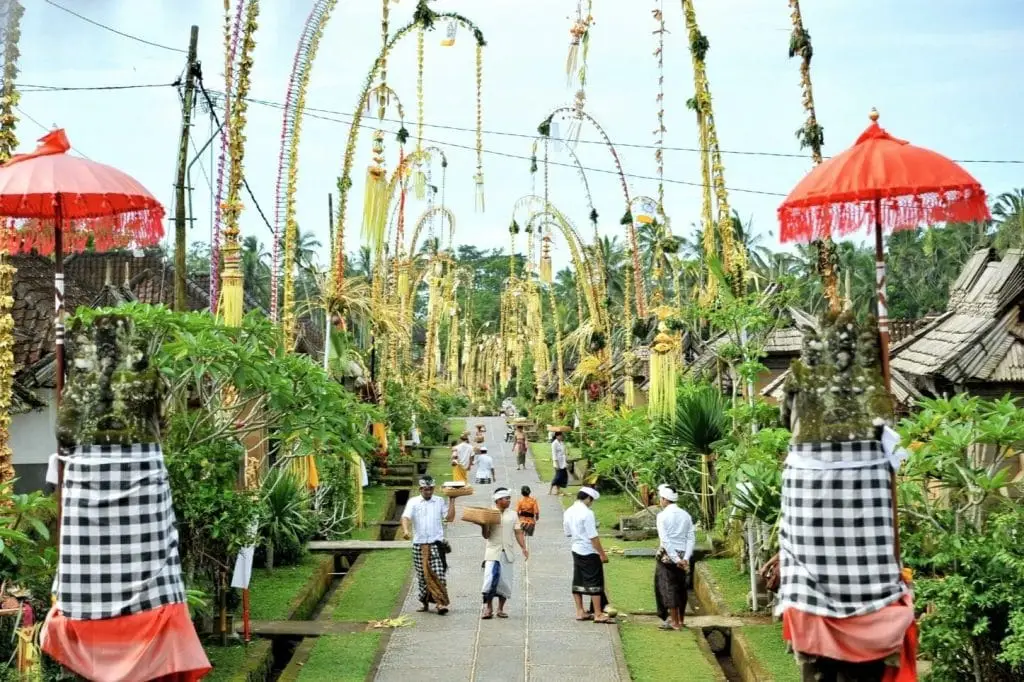 • Galungan and Kuningan commemorate the victory of dharma (good) over adharma (evil). During this period, streets are lined with penjor, tall bamboo poles decorated as offerings to the divine.